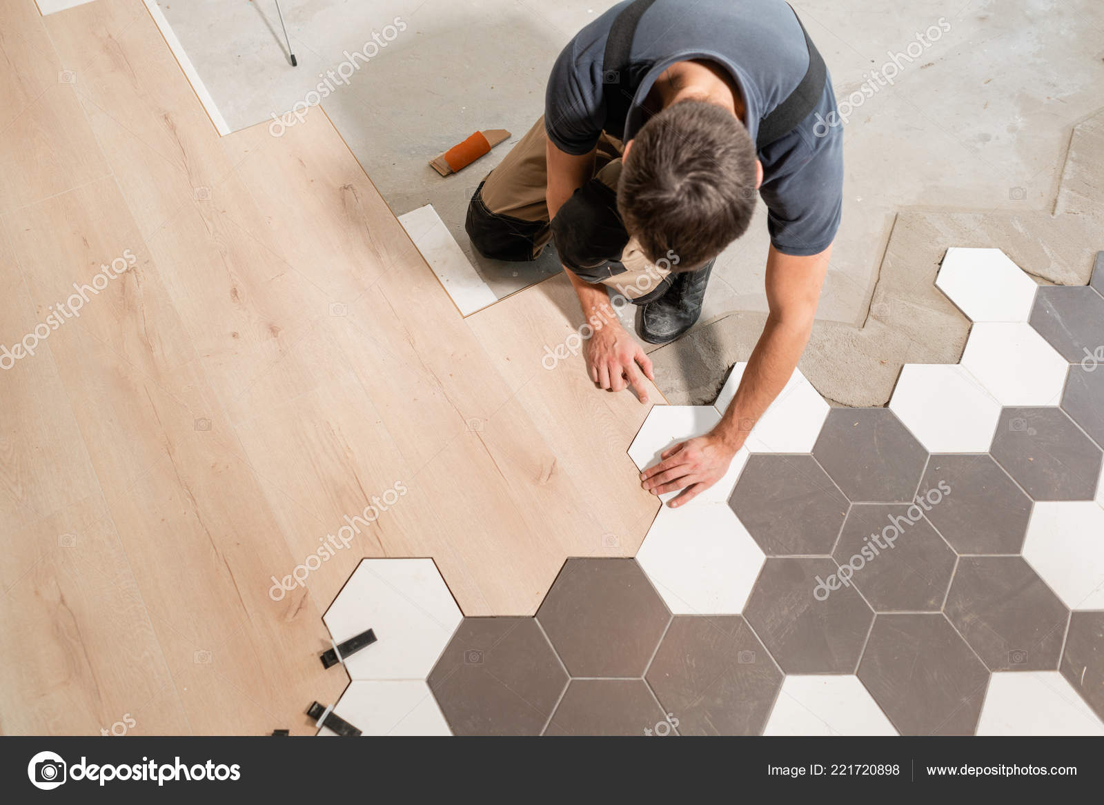 Male Worker Installing New Wooden Laminate Flooring The Combination Of Wood Panels Of Laminate And Ceramic Tiles In The Form Of Honeycomb Kitchen Renovation Stock Photo By C Malkovkosta 221720898